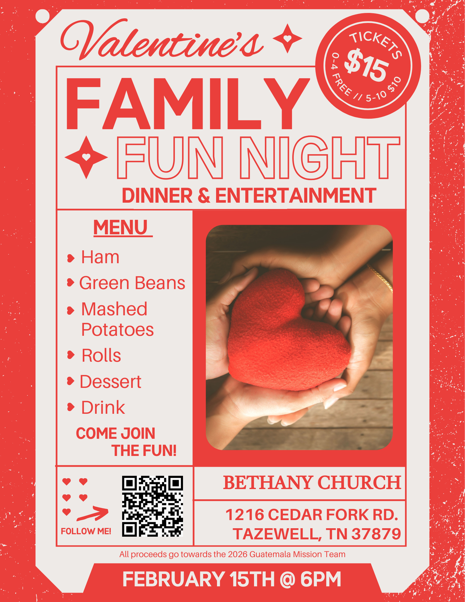 Join us for a fun-filled Valentine's Family Event on February 15th @ 6:00PM at Bethany Church, 1216 Cedar Fork Rd., Tazewell, TN. Enjoy a delicious meal featuring ham, green beans, mashed potatoes, dessert, roll, and a drink. All proceeds benefit the 2026 Guatemala Mission Team. It’s a great way to spend time with your loved ones while supporting a great cause!