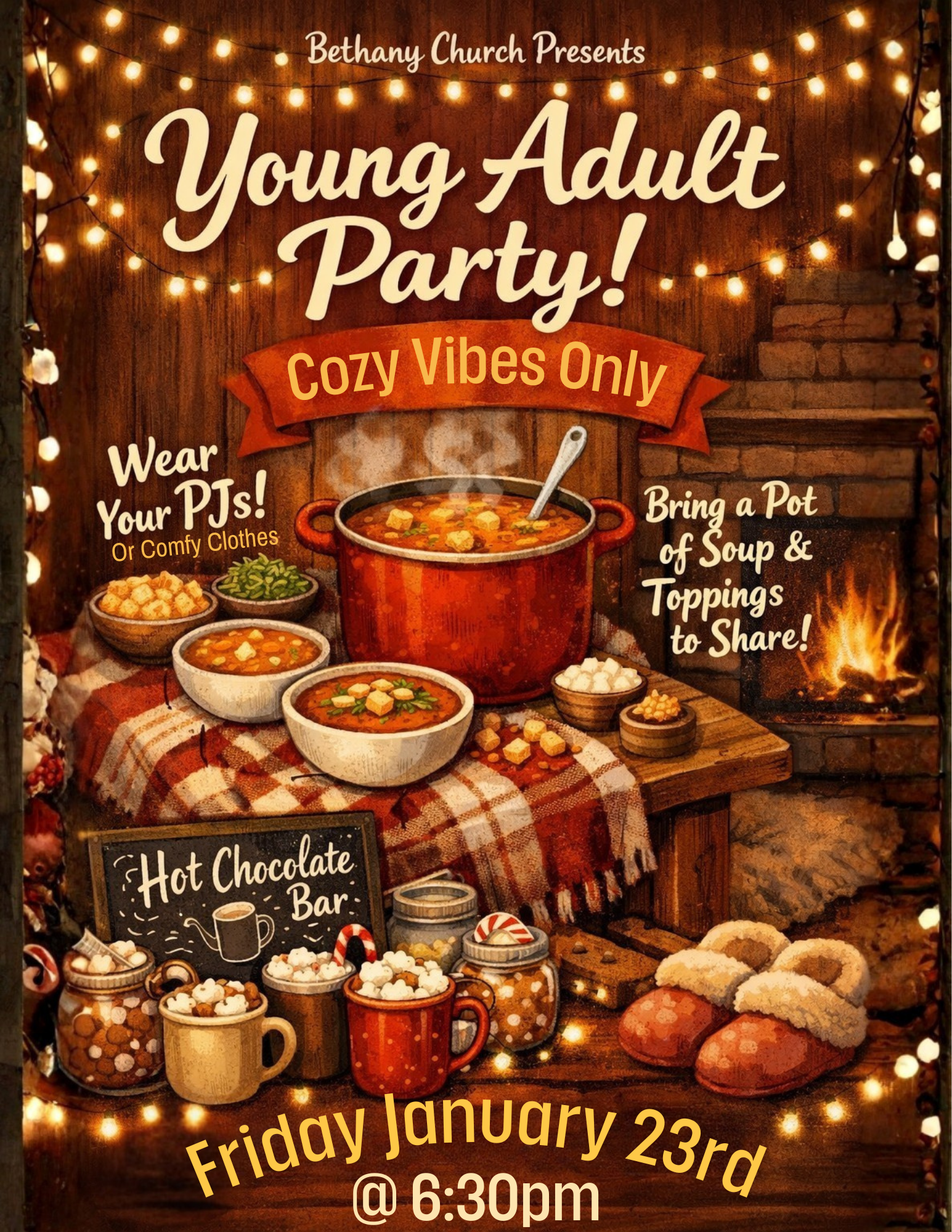 Grab your comfiest PJs and join us for a relaxed, joy-filled Young Adult Party! We’re gathering for cozy vibes, community, and connection around a shared soup night—bring a pot of your favorite soup and any toppings to share. We’ll also have a delicious hot chocolate bar waiting for you. Come as you are, bring a friend, and enjoy a night of laughter, warmth, and meaningful connection.